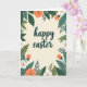 This card features a creamy beige background with “happy easter” written in dark emerald lettering centered on the front, with a gentle, welcoming look 🌷. Around the edges, a leafy border forms a cozy frame, like a garden wrapping its arms around the message. Deep teal leaves with fine vein lines mix with lighter olive branches, creating layered greenery that feels calm and close. Bright orange flowers with darker centers appear in small clusters, adding a friendly spark among the greens. White, daisy-like blooms with sunny yellow centers sit near the corners, as if leaning in toward the words like companions. Tiny coral-orange buds tuck between stems, giving the border a soft, affectionate rhythm 🐇. The text stays clear in the open center while the plants and flowers gather along the perimeter in an even, balanced ring. A faint, paper-like texture sits over the flat colors, and the border shows teal leaves, olive sprigs, orange blossoms, white daisies, and coral buds encircling the emerald greeting.