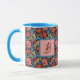 This lovely pink, blue, green floral coffee mug is inspired by the work of William Morris, who was a well-known and talented British textile designer, writer, and activist. It features a large monogram initial in burgundy script aganst a colorblock of pink that's bordered in a coordinating French blue. This mug would be a lovely way to start your morning or end your day, or else would make a great gift.