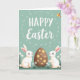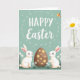 This card features a soft teal background with a festive message in white lettering placed near the top, framed by scattered white dots and small starburst shapes 🌷. Below, two fluffy white rabbits with long ears, pink inner ears, and rosy cheeks sit on either side of a large brown egg, leaning slightly inward as if sharing a quiet, friendly moment 🐰. Their eyes angle toward the center, creating a gentle sense of togetherness without needing extra decoration. The egg is decorated with bright yellow flower shapes that stand out warmly against the brown surface. Along the bottom edge, a strip of green grass spreads across the scene, dotted with small white-and-yellow daisy-like blooms. In the upper right, a small bird with yellow and orange feathers hovers as a lively accent against the calm background. Tiny white dots and starbursts continue to sparkle around the top text, while the rabbits and egg sit grounded in the meadow below.
