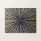 An intricate ceiling design radiates from a central floral motif