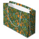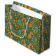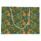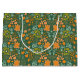 Seamless floral pattern on a dark green background featuring stylized orange, yellow, and teal flowers, leaves, and abstract shapes.