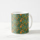 Seamless floral pattern on a dark green background featuring stylized orange, yellow, and teal flowers, leaves, and abstract shapes.