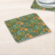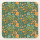 Seamless floral pattern on a dark green background featuring stylized orange, yellow, and teal flowers, leaves, and abstract shapes.