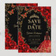 Black red gold Quinceanera celebration save the date card. Features brunette girl in ball gown dress, script font, gold butterflies, watercolor roses and tiara. Perfect for an elegant princess style glam celebration. Personalize with your own details. Printed Zazzle cards or instant download digital printable template.