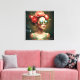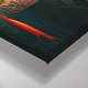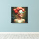 A woman with a crown of large pink flowers and round sunglasses reflecting a landscape, partially submerged in water with hummingbirds and goldfish.