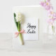 This design shows a diagonal bouquet of small white, star-shaped blossoms with faint yellow centers, nestled in rich green stems and leaves, resting on a bright white surface. A soft pastel pink ribbon wraps the stems and forms a simple bow, adding a gentle, affectionate touch like a quiet gift left for a close friend 🌷. The flowers sit to the left, and their natural curves lean toward the open space on the right, as if reaching across the table. On the right side, a white greeting card stands upright, keeping the layout balanced and calm. Across the front of the card, a seasonal greeting appears centered in flowing black lettering, with generous white space around it. Soft, diffused light brings out the petal texture and a slight sheen on the ribbon, with only faint shadows beneath the stems 🐇. The greenery shifts from deep emerald along the leaves to a paler tone near the base, while the card’s crisp edge stays sharply defined against the white background.