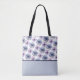 Pretty lavender and blue flowers decorate this reusable tote bag. The bottom third (approx.) is a coordinating solid with a thin stripe. Image rendered with AI by IveyCottage.