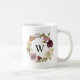 Customizable mug featuring a burgundy, pink and white floral watercolor wreath with green foliage accents. This elegant wreath frames a classic black monogram. Easy to personalize and makes a great gift.