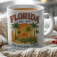 Visa upp ditt Florida-pride med den här vintage-stil solskenstaten mugg. Med en alligator som vilar av handflatan träd, en surfbräda, och en vågad orange solnedgång, firar denna design Floridas naturskönhet och tropiska vibe. Med "Florida Est. 1845-tumsskärmen är perfekten souvenir eller gåva till strand älskare, resenärer och lokalbefolkningen som vill njuta av en paradis med morgonkaffet.