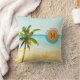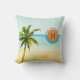 En fredlig vattenfärgsscen i himlar, hav och sand visning i Florida strand med sitt stora handflatan träd och vår logotyp för "Florida... där sol bor." Det dominerande färg är orange, turkos, blått, grönt och, naturligtvis, sand. Det finns en punkt för ditt monogram-inledande inuti bilden i sol... eller så kan du infoga annan text (eller ta bort). Baksidan av kudden visar lite mer handling, med två handflatan träd och en segelbåt i avstånd under ett ljust himlar.