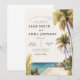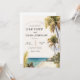 Denna bröllopsinbjudan visar en strandscen i Florida Keys där en strand är fylld med palmer och lokal grönska,