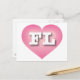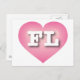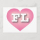 Detta vykort har ett pulserande rosa hjärta med ett vitt tvättat centrum som innehåller det fetstilta vita övre brev FL, officiellen förkortning för Florida, solskenet. Baksidan av vykortet är tom och väntar på dina handskrivna känslor eller anpassade texter.