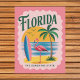 Bläddra upp sol med det vackra Florida-vykortet, med en charmerande återstrandscen och den stolta titeln "SUNSHINE STATE"! Denna sjudande vintage-inspirerade illustration fångar perfekt återfall, tropiska viber från Florida i USA, som visar en elegant rosa flamingo på sandstränderna, en klassisk handflatan träd och en coola surfboard. Den ljusa färger och lekande utformningen framkallar minnen från ändlösa sommardagar och kustavslappning.