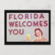 1950 års Florida välkomnar dig. En kvinna som har ett glas vintage i orange juice inspirerade till vykort.