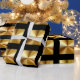 Flott gåvasjalpapper i ett kallt guld och en svart design, som inkluderar guld- tittar metalliskt, kvadrerar mönster som kontrasterar nicely med den svart bakgrunden. Använda som en exklusiv slående in papper design för den speciella födelsedag eller tillfälle så dig kan sjalen dina gåvor i stil.
