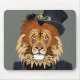 Denna design presenterar porträtt av ett lejont i en man affärskostym och hatt.