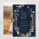 Foto Boho för marin Elegant sparar datumet. Den här eleganten och snyggtens spara-till-datum-anslagskort innehåller fantastiska, handmålade vilda blommor med vattenfärg som ordnats som en underbar krans och ett förlovning på baksidan som är perfekt för vår, sommar eller fallbröllop. Sök efter matchande objekt i samlingen Navy Blue Boho Wildblomma Bröllop.