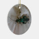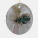 Denna söt besläktade stil-prydnadsföremål har ett foto av en blåaktig färgad av grönt British species of Oil Beetle sitta on a white Carnation blomma. Fotot togs med hjälp av makrofotografi för att visa detaljrikedomen och färg i denna vackra skaldjursart. Det finns vit text på anpassadet på utsmyckningens baksida som gör att du kan anpassa den.