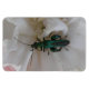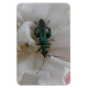 Denna fantastisk-magnet har ett foto av en blåaktig grönt färgad British species of Oil Beetle sitta på en vit nejlikblomma. Fotot togs med hjälp av makrofotografi för att visa detaljrikedomen och färg i denna vackra skaldjursart.