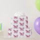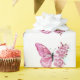 Arrangemanga av rosa butterfly med rosa japanska körsbärsprodukter på vit bakgrund.