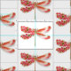 Artistiskt ritad, guld, smyckad drakfluga med rött och vingar dekorerad med rött, blomning, smyckad japansk körsbär på vit bakgrund. Guld Dragonfly.