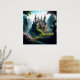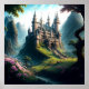 Det här är en poster av ett vackert, fantasirikt, klassiskt sagolslott i en lush, grönt ängsskugga med rosa blommor. Det gjordes med Leonardo.ai.