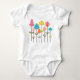 Bandkostymen i baby har en modern design i mitten av århundradet av blommor som tillverkats av fyrkanter, ovaler och diamanter som har manipulerats för att bilda blommor.