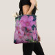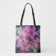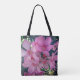 Den här väskan innehåller ett foto av ljusa oljefärger i rosa tillsammans med mörk grönt löv. Den ljusa blomman i det här fotografiet visningar långa petaler och ett centrum för rosa av mörk. De mogna blommorna åtföljs av små rosor av mörk. Samma naturbild visas både på matkassens framsida och baksida.