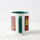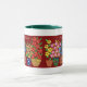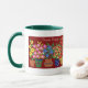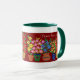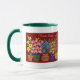 En ring mugg med grönt läppar och handtag och en rad färgade blommor, från ett handmålat pappert kollage av Judy Adamson. Anpassade.