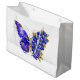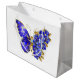Smycken, blå, safir, mousserande blomfjäril med vinge som dekoreras med blå, ädelblommor med guld löv på vit bakgrund.