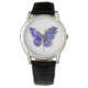 Jewelry, blue, sapphire, sparkling flower butterfly with wing decorated with blue, precious flowers with gold leaves on white background.