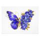 Smycken, blå, safir, mousserande blomfjäril med vinge som dekoreras med blå, ädelblommor med guld löv på vit bakgrund.