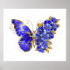 Smycken, blå, safir, mousserande blomfjäril med vinge som dekoreras med blå, ädelblommor med guld löv på vit bakgrund.