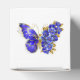 Smycken, blå, safir, mousserande blomfjäril med vinge som dekoreras med blå, ädelblommor med guld löv på vit bakgrund.