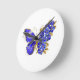 Smycken, blå, safir, mousserande blomfjäril med vinge som dekoreras med blå, ädelblommor med guld löv på vit bakgrund.