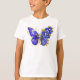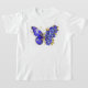 Smycken, blå, safir, mousserande blomfjäril med vinge som dekoreras med blå, ädelblommor med guld löv på vit bakgrund.