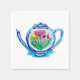 En tekanna har färgstarka blommor inuti. Rosans, gultens och gröntens pulserande nyanser framträder, vilket skapar en slående kontrast till den blå tekannan.