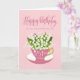 En liten rosa te kopp fylld med ett vackert gäng liljor från dalen, tillsammans med handskriften ord Grattis på födelsedagen på kortets överkant och handskriften ord 51 i dag med kärlek hjärtan på te kopp. Ett sött födelsedagskort för din svärdotter som blir 51 idag.