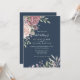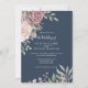 En vattenfärgsdesign för elegant av stort ro i ljusa rosa nyanser på marin blå bakgrund. Kortets baksida har en liten blommigt arrangemang i mitten. Du kan lägga till information på menyn "Redigera design". Inbjudan är en del av en vacker matchande bröllop-svit som kan vara helt personlig.