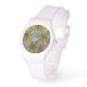 Blommor med grönt blad är handdragna med prickade mittpunkter och presenteras i blandade medier.