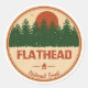 Landskogen i Flathead är en western skog i Montana, precis söder om Glacier nationalpark. Med den här designen visas träd och topo linjer med ett solnedfall.