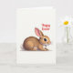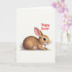Denna design visar en liten kanin 🐰 som vilar lågt på vänster sida av en enkel, ljus bakgrund, med kroppen uppdragen som om den väntade på en försiktig hälsning. Pälsen är nyanserad i varma bruna och krämiga toner, med en mjuk rosa nyans på insidan av öronen och på näsan som ger ett ömt och tillgiven uttryck. De mörka, glänsande ögonen tittar mot höger, och de små ljusreflexer som syns i dem ger en känsla av en tyst och vänlig kontakt över det öppna utrymmet. Fina morrhår och en rund liten svans är detaljerat utformade med mjuka höjdpunkter, vilket ger kaninen en mysig och taktil textur. I det övre högra hörnet sitter en kort påskhälsning i rött, skriven med flytande, kursiv stil som svänger lätt ovanför kaninens blick. Den breda, rena bakgrunden lämnar utrymme för budskapet och får kan