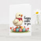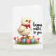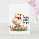 This card shows a fluffy baby chick with pale cream feathers, deep brown eyes, and a bright orange beak, giving a sweet, friendly look as if it’s posing for someone it trusts. A small red bow tie sits at its neck, adding a dressed-up touch that feels like a tiny date-night accessory. The chick stands atop a cluster of decorated eggs in soft pastel blues, pinks, yellows, and coral, with patterns like stripes, dots, and little stars that suggest shared laughs and gentle teasing. Around the eggs is a patch of green grass with a few small red flowers, like a spring spot where friends might linger and talk 🌷. The background stays white, keeping the scene airy and letting the colors stand out. On the right side, the greeting text is placed in a flowing style, written in dark gray, with the words stacked neatly so they balance the illustration 🐇. The eggs are nestled closely together beneath the chick, and the grass blades curl upward around their edges.