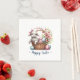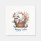 pappra påsk-servetter med flytande vitt lamm sitta i ett vävt basket, omgivna av färgstarka Påskägg. Äggen är målade i vibrerande nyanser. Blommor och löv är på toppen av kant och skapar en festlig och glad scen.
