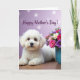 This card shows a fluffy small white dog lying calmly, looking straight out with big dark eyes that feel like a gentle, affectionate gaze ❤️. Its soft-looking fur is detailed with light shading that makes it seem cozy and cared for, like a quiet moment shared with someone close. To the right sits a teal vase holding a full bunch of flowers in magenta, pink, purple, and white, arranged like a cheerful gift 🌼. The background is a pale lavender wash with softly blurred light spots that add a dreamy, intimate glow to the scene. Near the top, the words “Happy Mother’s Day!” are placed above the picture in a flowing cursive style, colored in a dark tone that stands out against the light backdrop. Everything is set on a warm wooden surface with a smooth finish, adding a homey, comforting feel beneath the airy colors. The soft lighting highlights the dog’s face and the flower petals, creating a tender, friendly mood between the viewer and the scene. The teal vase is positioned on the right side, with the brightest pink blooms reaching slightly upward toward the text.