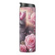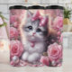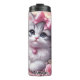 Den här förtjusande bilden har ett snyggt flytande grått och vit kattunge med ljusblå ögon. Den är försedd med en stor rosa båge och en rosa hjärtan. Kattungen sitter i vackra rosa ros och mousserande pärlor och skapar en mycket söt och elegant feminin scen.