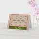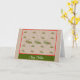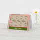 Gröna flugor med röda kanter och grön block med prydlig stil som säger "God Jul". Bakgrunden är en falsk jute design. Inuti kortet står det "Må du fånga julstämningen"! Bedårande julkort för flugfiskaren denna jul.