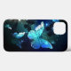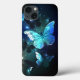 Fantastisk, glödande, blå och gult, nattfjäril mot mörkens bakgrund.