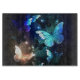 Fantastisk, glödande, blå och gult, nattfjäril mot mörkens bakgrund.