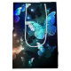 Fantastisk, glödande, blå och gult, nattfjäril mot mörkens bakgrund.